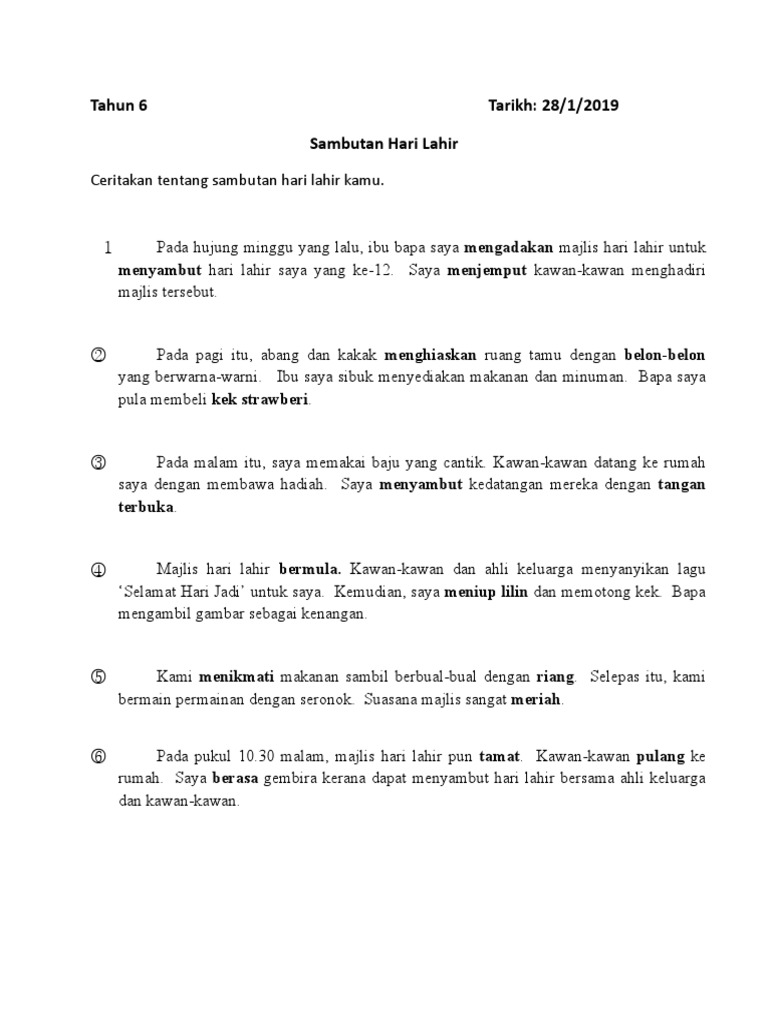 Tulis sebuah karangan tentang pengalaman kamu sepanjang majlis hari jadi tersebut. Parlimen pula diterajui oleh Perdana Menteri dan majlis menteri-menteri. Majlis Hari Lahir Saya Pada hari minggu yang lepas saya telah meraikan hari jadi saya yang ke-12 di rumah saya.